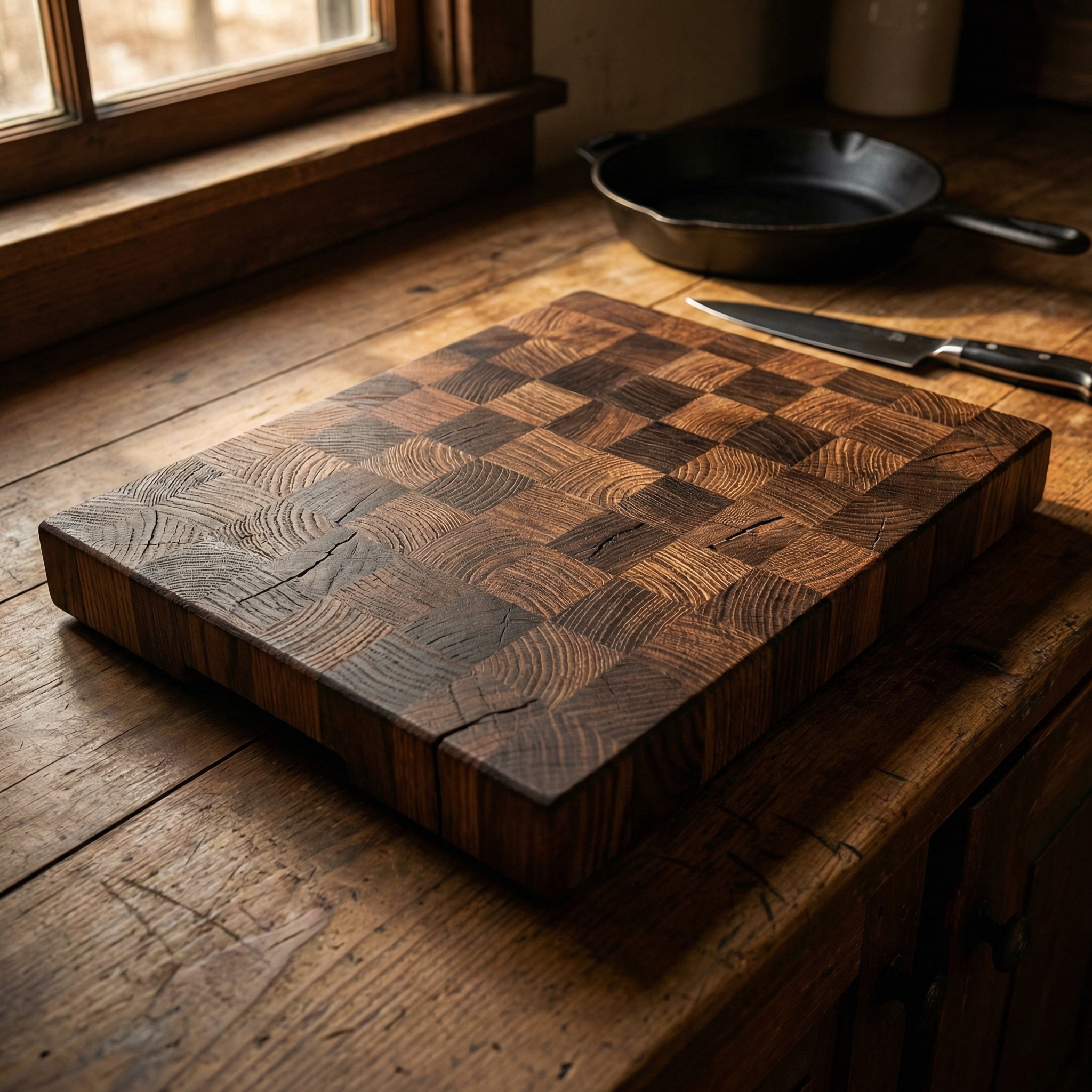 Das Kraftpaket für deine Küche. Durch die Verarbeitung als Stirnholz stehen die Fasern senkrecht, was die Klinge schont und das Brett extrem langlebig macht. Ein massives Statement aus europäischer Eiche.